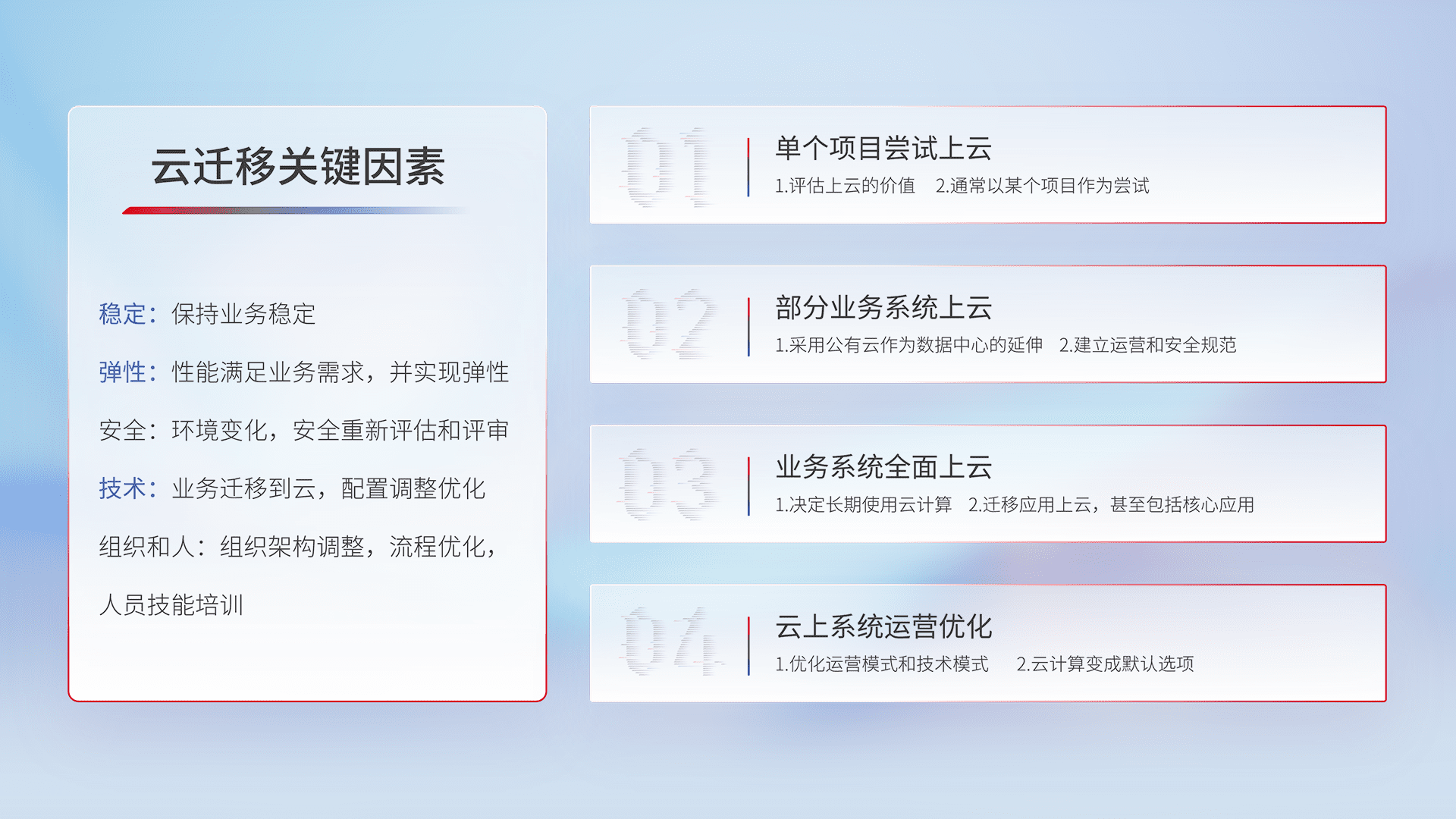 结合实际业务,,,从规划设计、、云平台选型、、、、云原生改造、、、数据迁移、、、集成交付,,迁移全过程为客户识别最佳上云路径,,,做好风险识别管理,,设计网络架构、、、身份权限、、安全审计合规、、、操作审计、、、、日志审计、、、监控告警策略、、、多站点容灾设计等,,,,对云上基础设施进行整体规划,,提升IT治理水平,,,,以满足弹性、、、高可用、、、高性能的需求。。