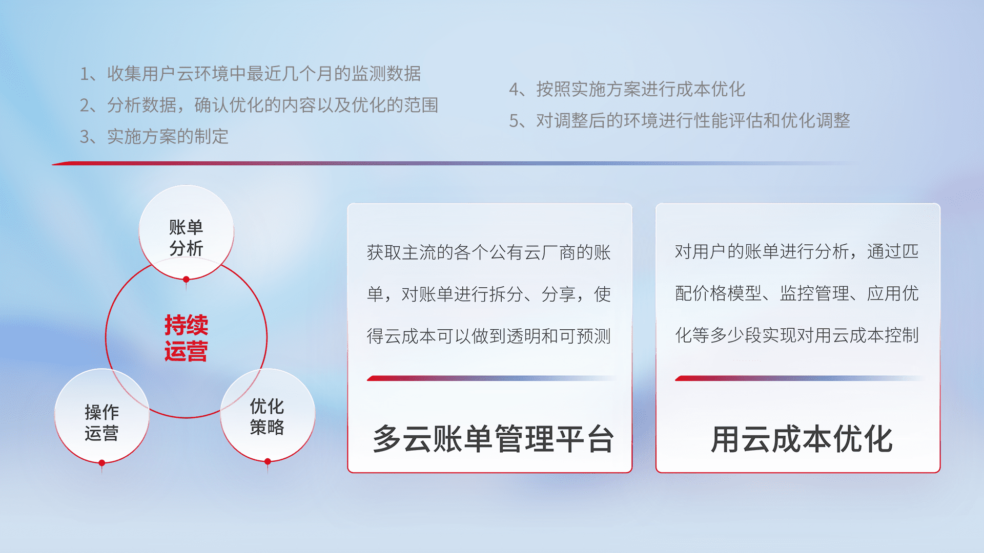 通过多云纳管,,以统一的资源数据模型把客户的云资源进行抽象和封装,,进而实现对多云资源的统一操作,,,,保障云资源管理的可靠性、、稳定性与可用性。。量身定制化运维内容,,,配置、、、、开发运维、、补丁管理、、备份、、、监控、、认证和访问管理、、、、审计和日常巡检等,,,,保障在用云过程中的可靠度,,,,稳定度以及高可用率。。。